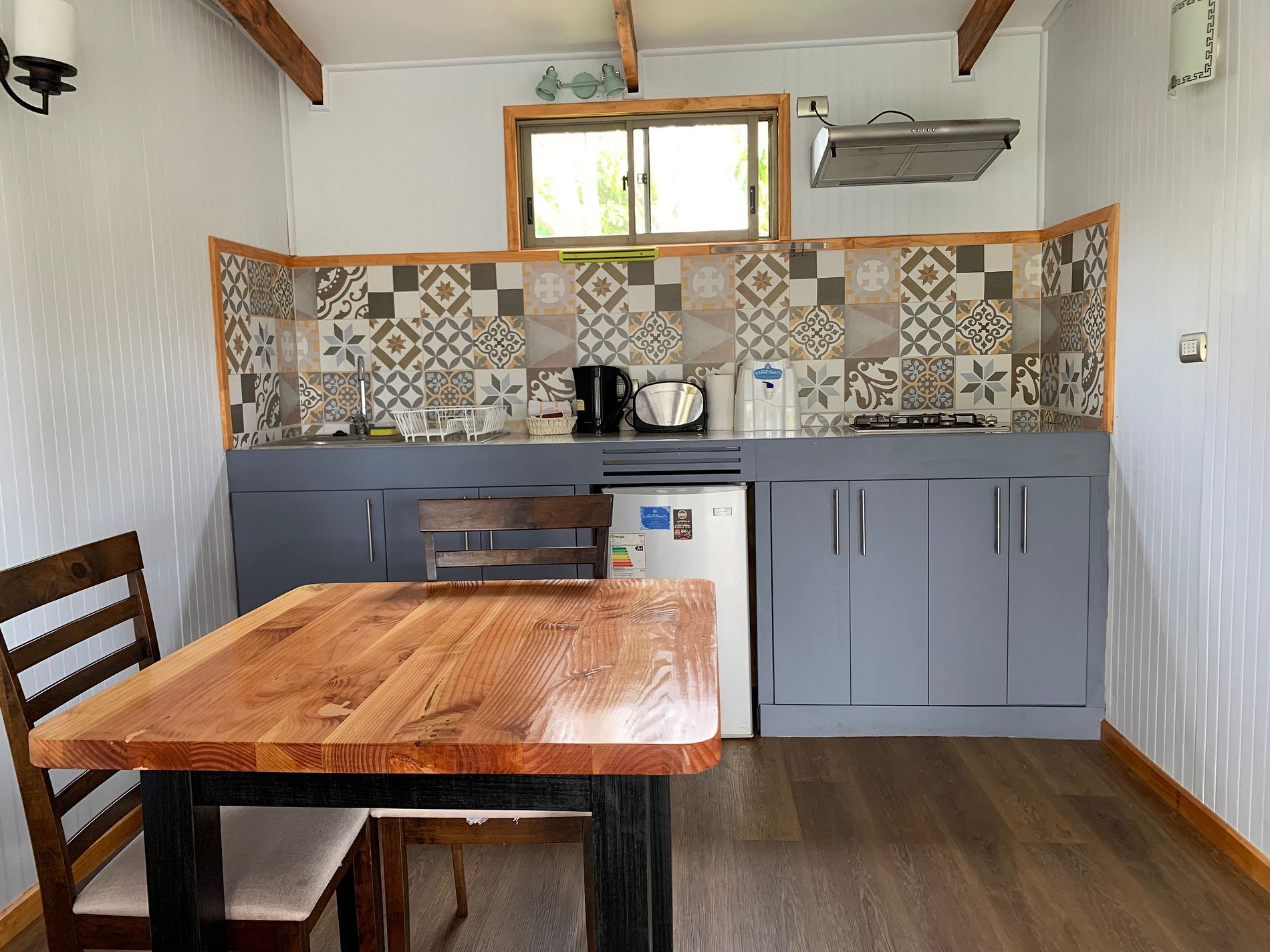 Cabaña privada de una suite, cama king. Area de comedor con cocina equipada con encimara y utensilios de cocina. Terraza amoblada, entrada independiente. Estacionamiento.